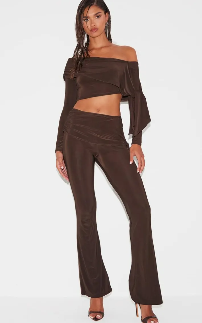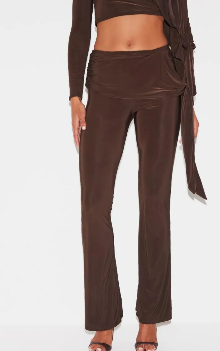 Show off your shape in these chocolate slinky ruched tie detail flare pants. Brought to you in a chocolate hue slinky material with a ruched design and tie detail, these flare pants are everything you need and more. Pair with the matching top, your go-to heels and simple accessories for a combo we’re crushing on this season.