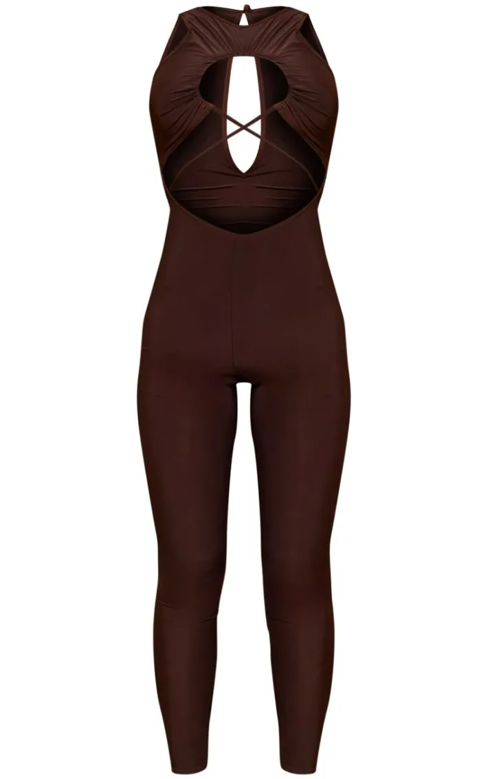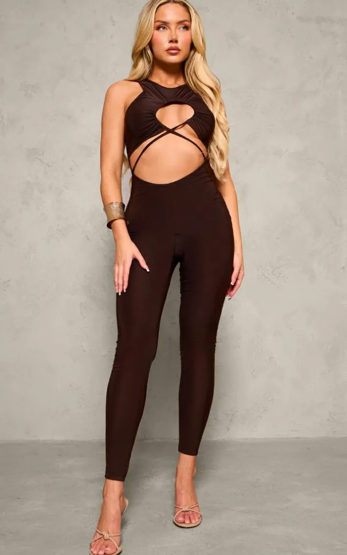 Turn heads for all the right reasons with this chocolate slinky twist front racer neck jumpsuit. Brought to you in a chocolate slinky material with a twist front and a racer neck design, what more could you want? Team this unreal jumpsuit with your fave heels and statement shades to finish off the look.