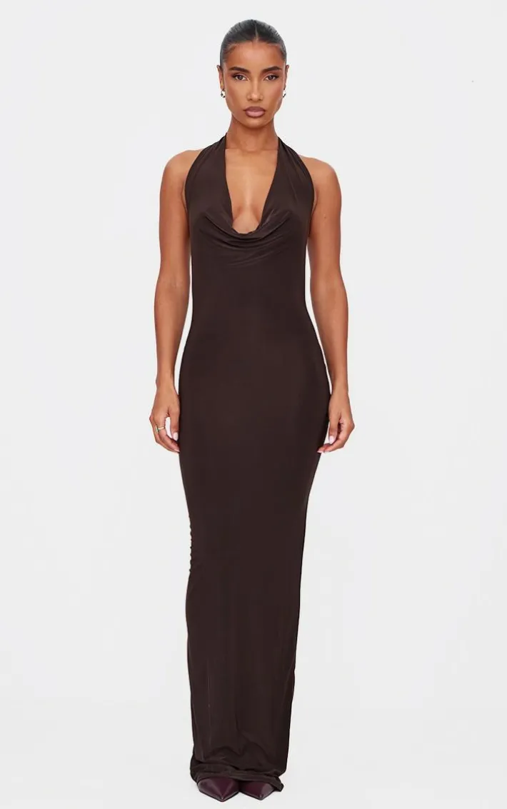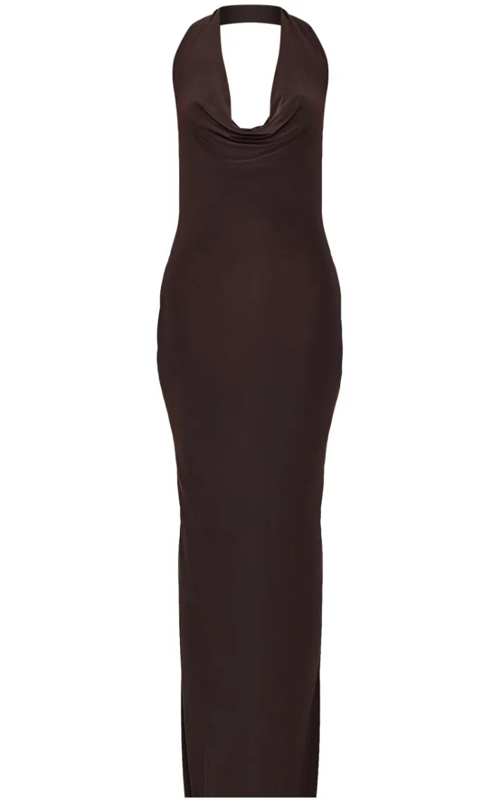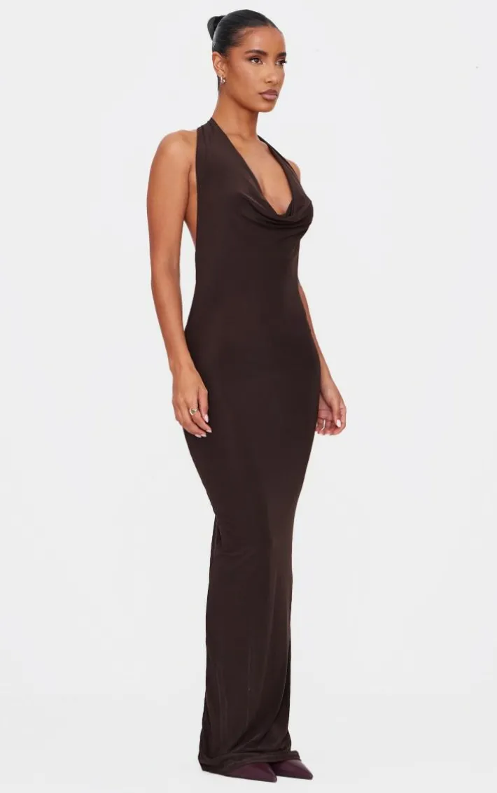 Make weekend styling look effortlessly chic with this chocolate soft touch cowl neck twist back detail maxi dress. Brought to you in a chocolate soft touch material with a cowl neckline, twist back detailing and a flattering maxi fit that will show off your shape in all the right places, what more could you want? Simply style this maxi dress with heels and gold accessories for a look that will steal all the stares.