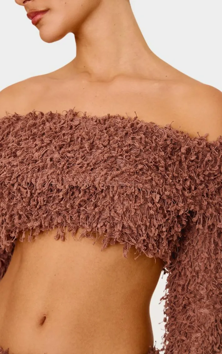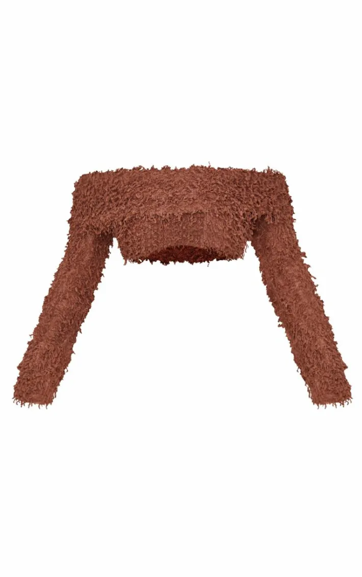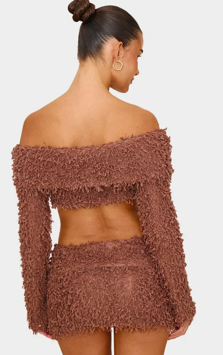 Take your weekend look to new heights with this chocolate textured fold over bardot long sleeve crop top. Made from a chocolate textured material with a old over bardot neckline and long sleeves, how can you resist? Style this crop top with the matching skirt and court heels for a look that is sure to turn heads.