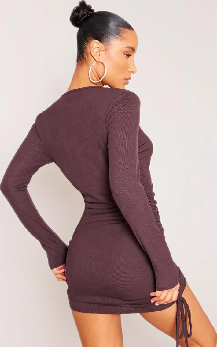 When the weekend calls for a little drama this chocolate thick rib ruched side bodycon dress will have you at the center of attention. It is made using achocolate thick rib material with a ruched side and a figure-hugging fit, what more could you want ? Style this with clear slip-on heels and statement accessories to elevate the look further.