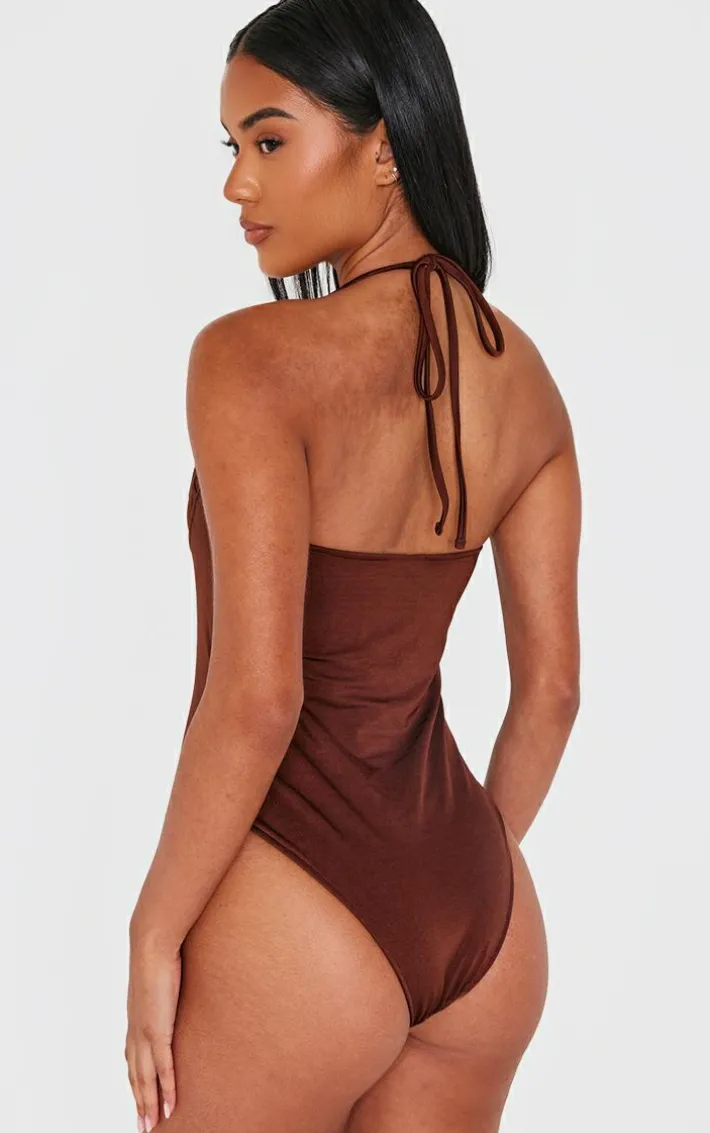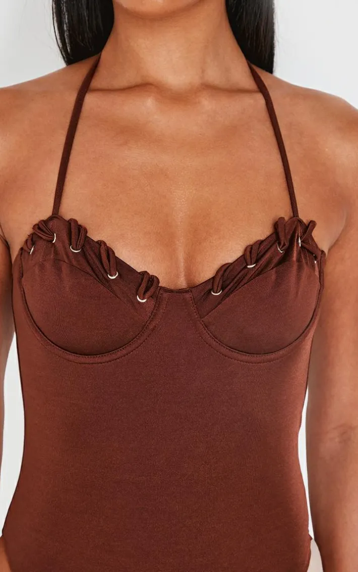 Soak up the sun in style on your next holiday with this chocolate underwired laced cup swimsuit. Made from a chocolate material with an underwired design and laced cup detailing, what more could you need? Style this chocolate swimsuit material with simple gold accessories for a look that won’t go unnoticed.