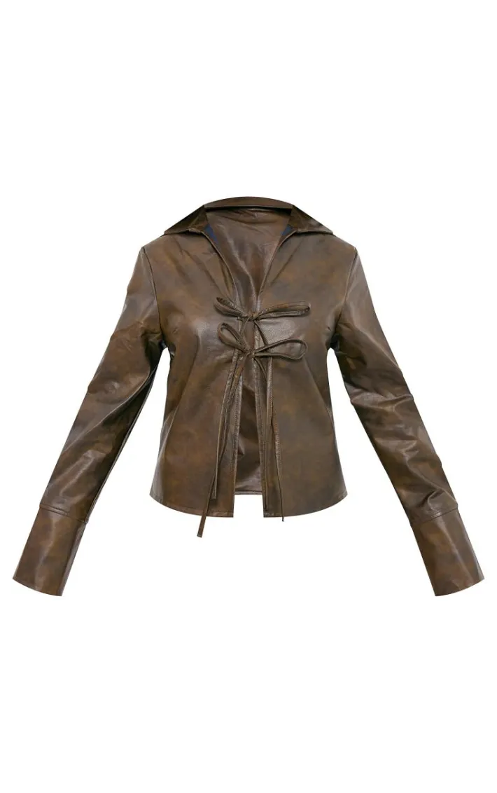 Add some edge to your new season wardrobe with this chocolate washed faux leather tie front shirt. Brought to you in a chooclate hue washed faux leather material with a tie front fastening, this shirt is a must have for your styling needs. Style with faux leather hot pants, knee high heels and gold accessories for a combo we’re crushing on this season.