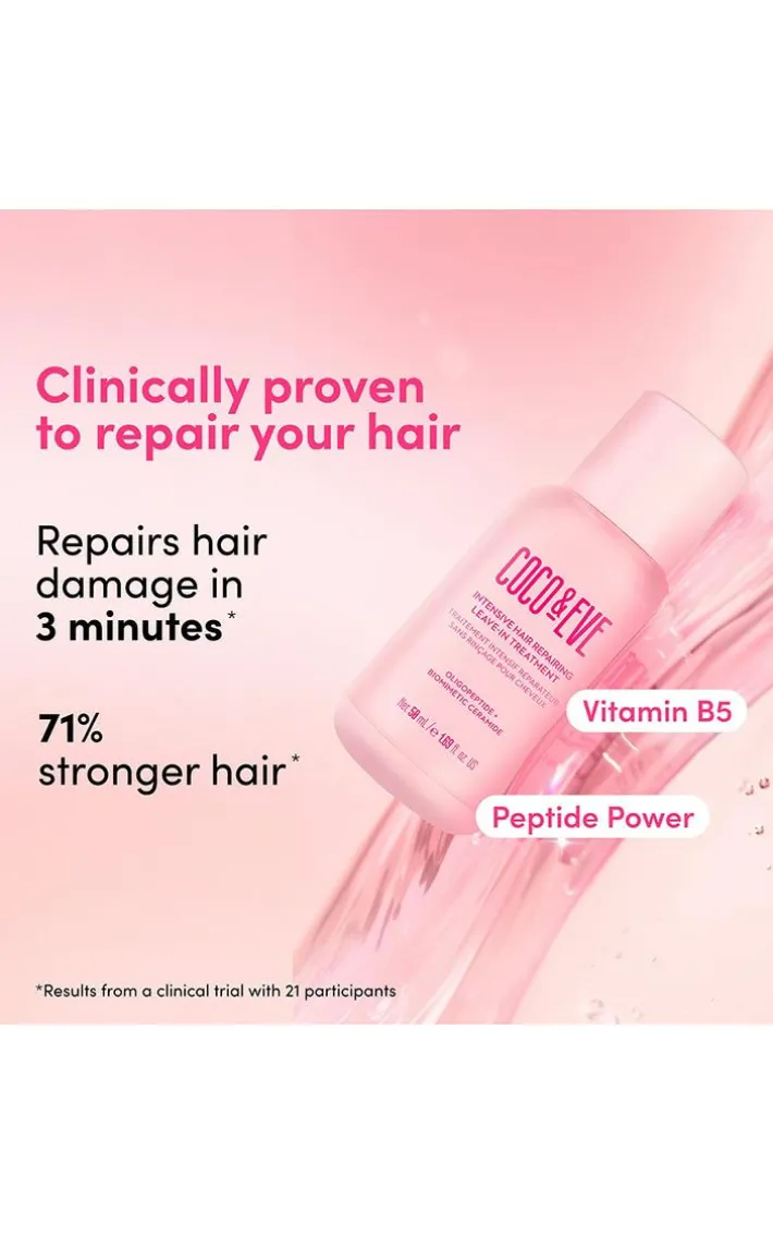 Get ready for hair that’s stronger than ever. Coco and Eve’s leave-in treatment clinically repairs hair damage in 3 minutes! Powered by a hair repair complex to repair the hair structure damaged by heat, chemical treatments and color. Scientifically formulated to deeply repair and restore.