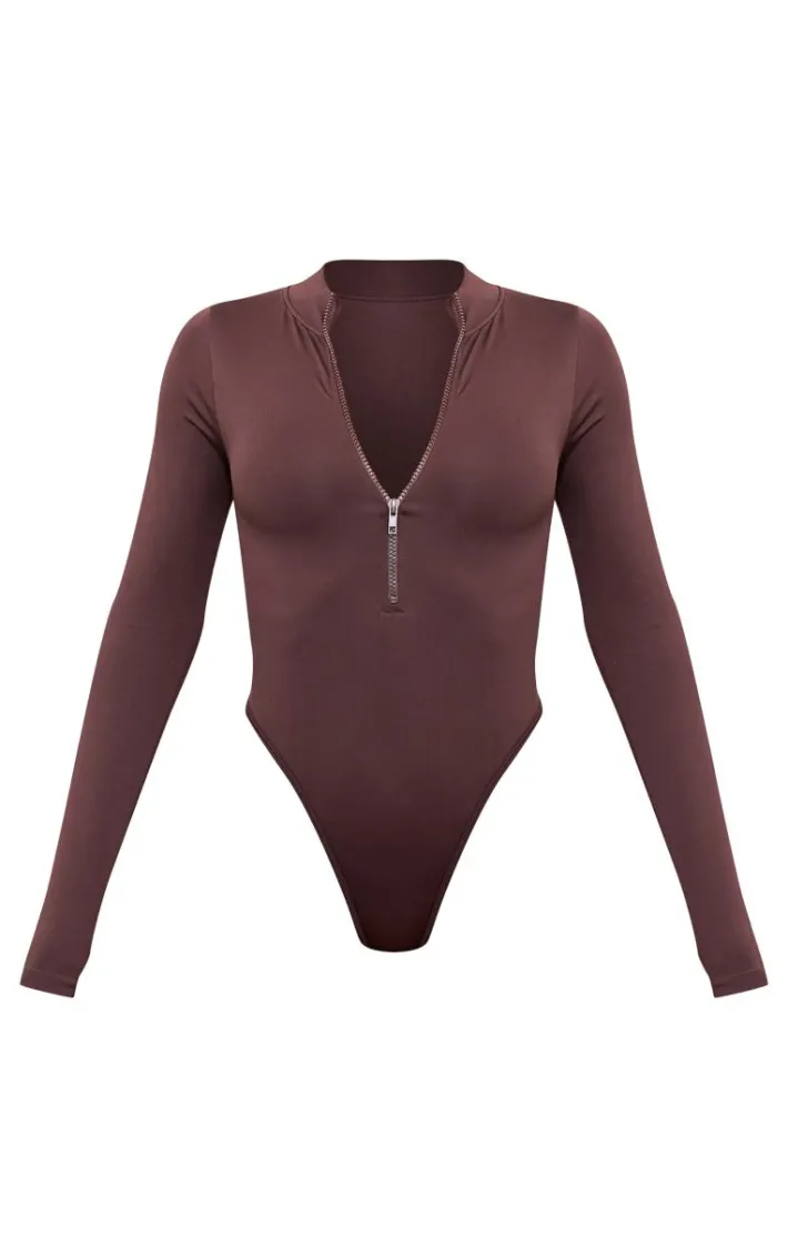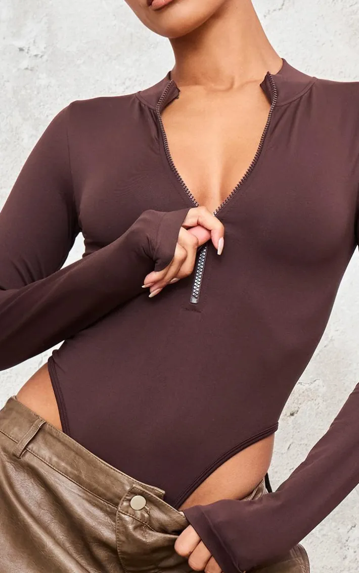 Turn heads for all the right reasons in this coffee contour zip up high neck bodysuit. Brought to you in a coffee hue contour material with a zip up detail and high neck design, this bodysuit is at the top of our wish list. Style with oversized shorts, knee high boots and gold accessories for an edgy look we can’t take our eyes off.