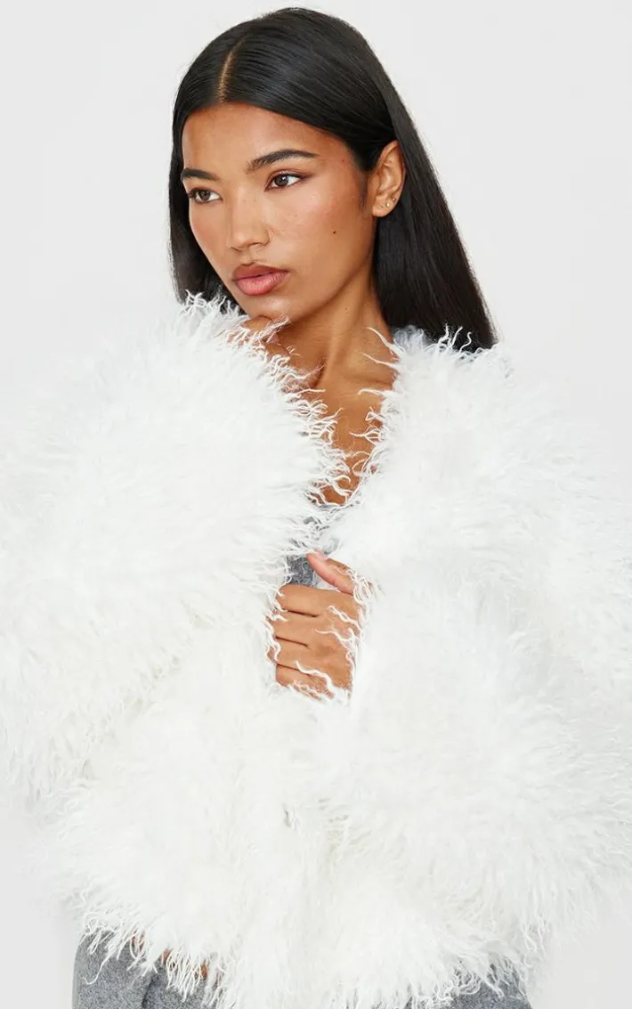 Look all kinds of chic in this cream faux fur cropped coat. Brought to you in a cream hue faux fur material with a cropped length, this coat is calling your name. We’re in love with this. Style with a grey two piece set and a pair of black loafers for a cosy finish we can’t take our eyes off.
