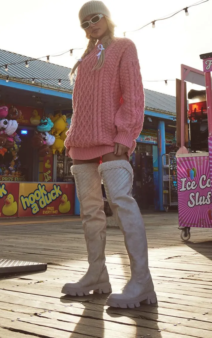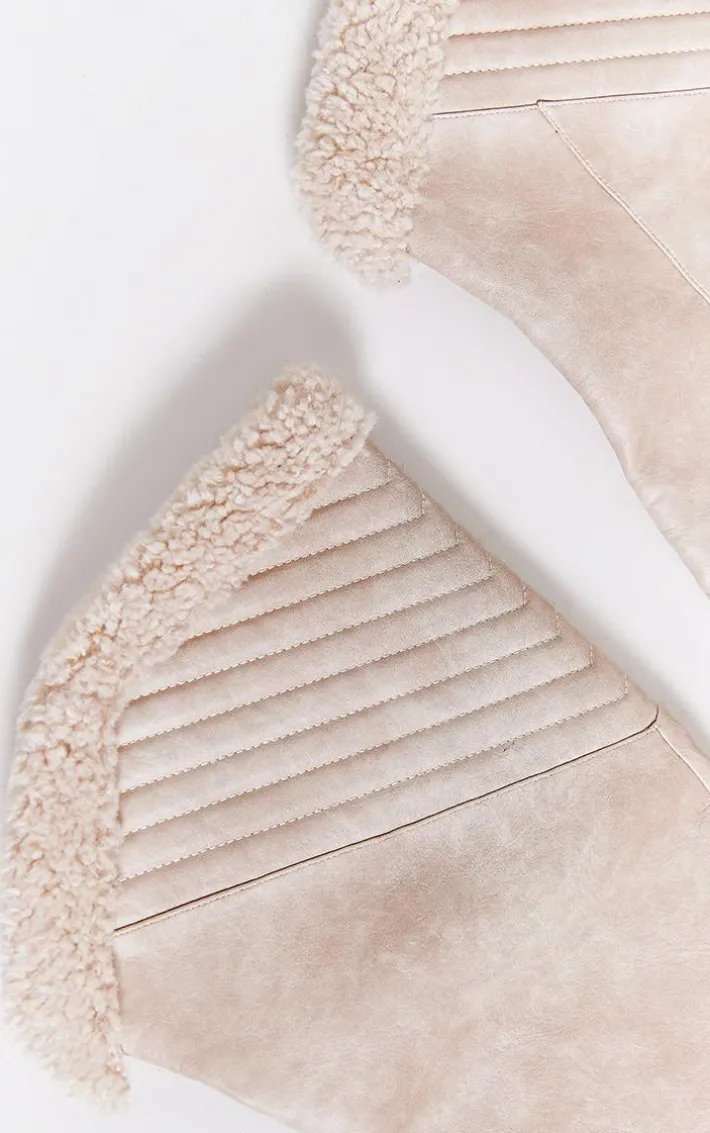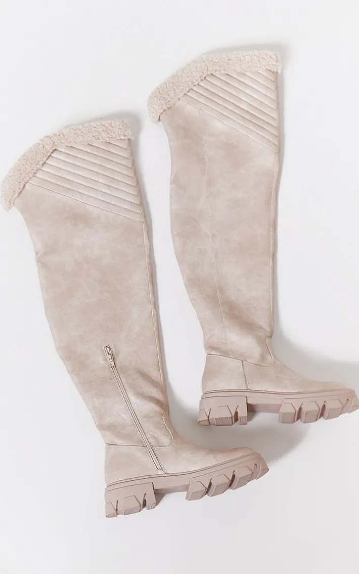 Say hello to your new shoe-drobe staple with these cream faux leather round toe shearling chunky knee high boots. These knee-high boots are brought to you in a cream faux leather material with a round toe, a shearling design and a chunky platform, what’s not to love? Style these knee-high boots with your outfit of the day for a vibe that can’t be matched.