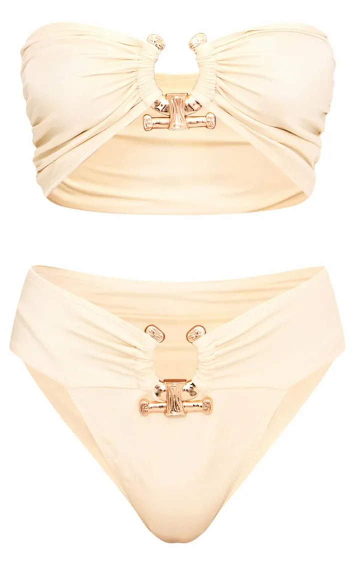 We are loving this bikini top for the poolside. Featuring a cream material with a gold hammered detail and a flattering fit. Style this with the matching bikini bottoms and your fave sunglasses to complete the look.