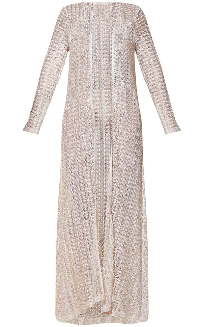 Take your vacay look to the next level with this kimono. Featuring a cream metallic netted crochet material with a relaxed fit and a maxi length. Style with your fave bikini and statement shades for the perfect poolside combo.