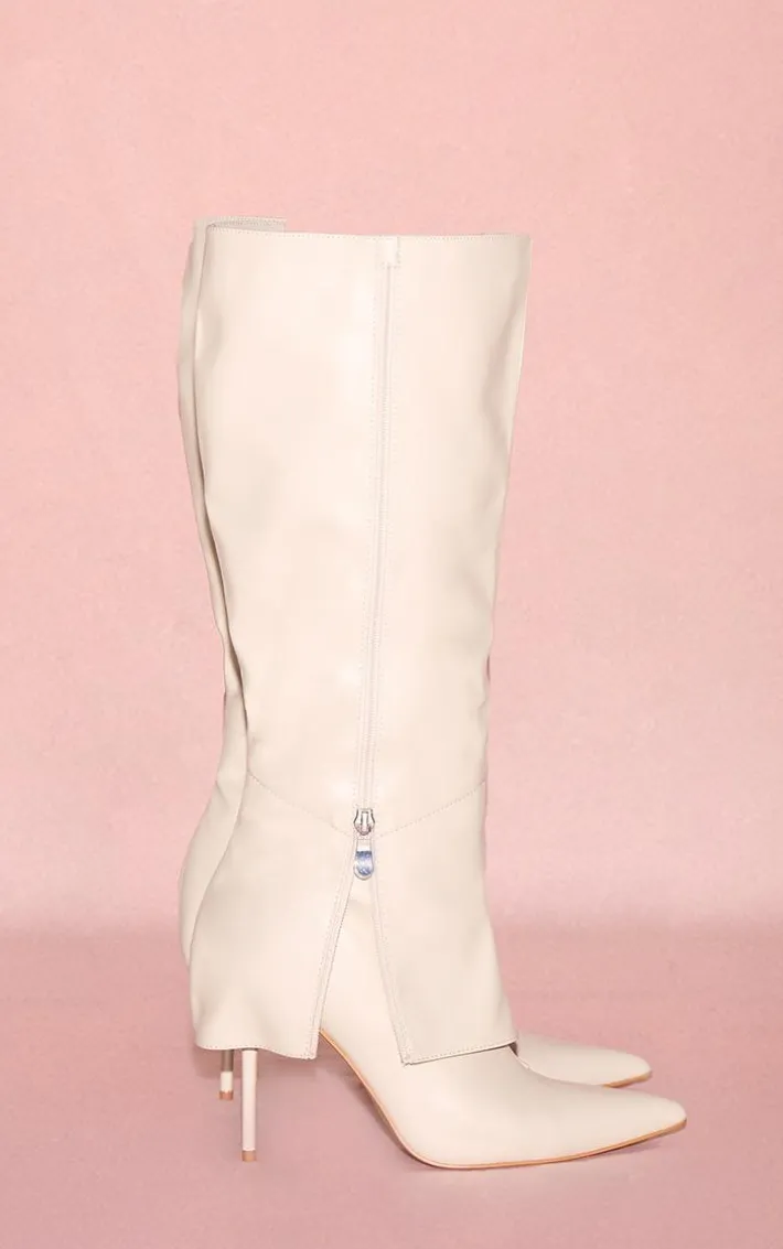 Add a little drama to your weekend look with these cream PU point toe fold over zip detail high stiletto heeled boots. Brought to you in a cream hue PU material with a point toe design, a gold over style and zip detailing, we are obsessed. Style these high stiletto heeled boots with your fave wardorbe pieces to instantly elevate your look.
