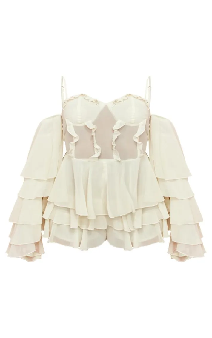 Turn heads for all the right reasons in this cream ruffle detail chiffon frilly skort romper. Brought to you in a cream chiffon material with a ruffle detail and a frilly design, this skort romper is calling your name. Style with bold hue heels and gold accessories for a figure-flattering fit we can’t get enough of.