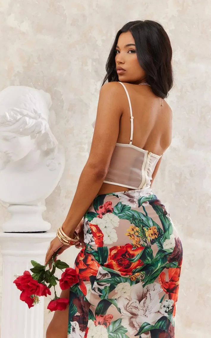 Add a little edge to your weekend wardrobe with this cream satin sheer panel corset. This corset is perfect for your upcoming plans with the dolls. With a cream satin material for all the luxe vibes and a sheer design, this corset will have you standing out from the rest. This unreal panel corset pairs perfectly with a statement floral skirt, some of your fave gold accessories, and your go-to clear heels for an effortlessly chic look you will be loving.