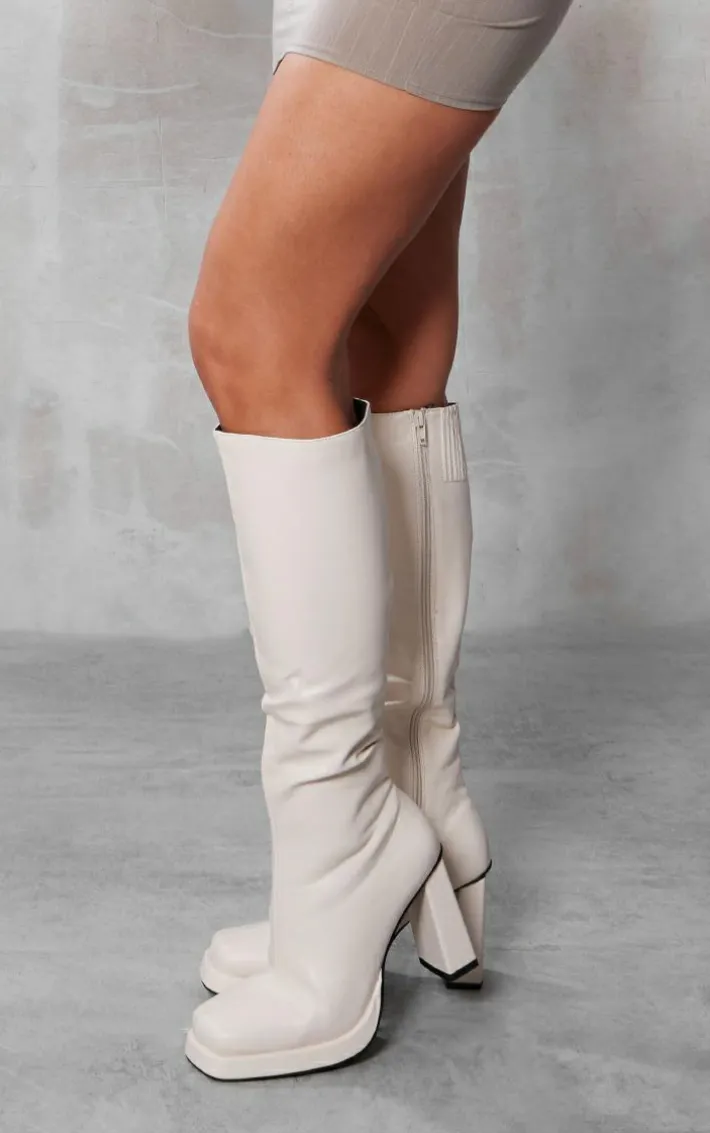 Stand out in every room with these cream slight platform block heel square toe knee boots. Brought to you in a cream material with a slight platform block and heel and a square toe design, what’s not to love> Its knee high length will have hearts racing no matter what. team with your fave dress and accessories for a fool proof finish.