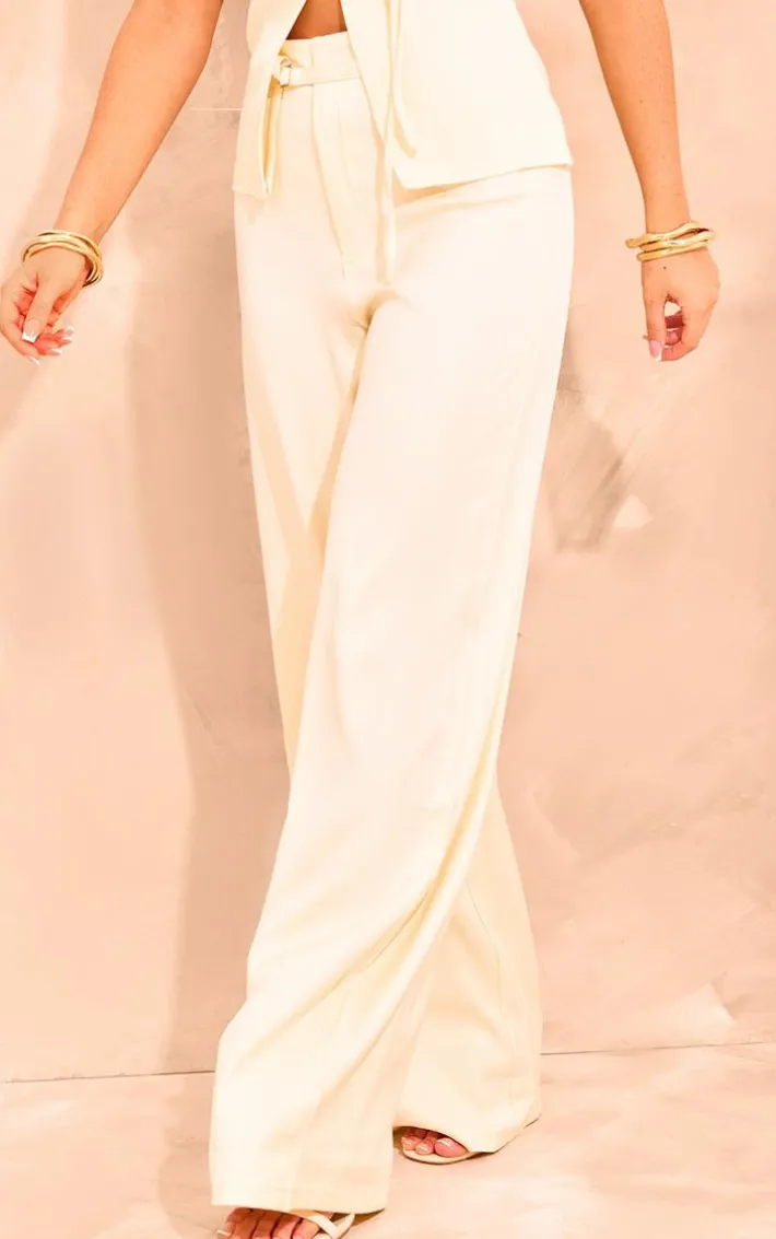 Add some chic vibes to your new season wardrobe with these cream woven tailored belt detail wide leg pants. Brought to you in a cream woven tailored material with a belt detail and wide leg fit, these pants are dreamy. Style with a vest, high heels and gold accessories for a luxe look.