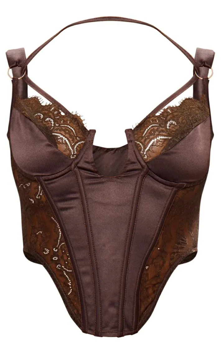 Get ready to have all eyes on you with this dark brown lace satin mix thick strap corset. This corset is brought to you in a dark brown satin material with a lace design and a thick strap design, we can’t get over this. This corset is everything and more we’re loving paired with a faux leather skirt, high heels and an oversized jacket for a look like no other.