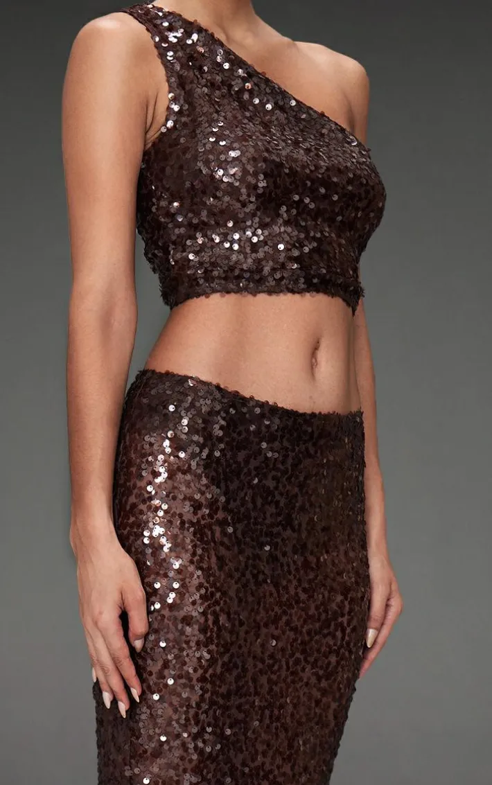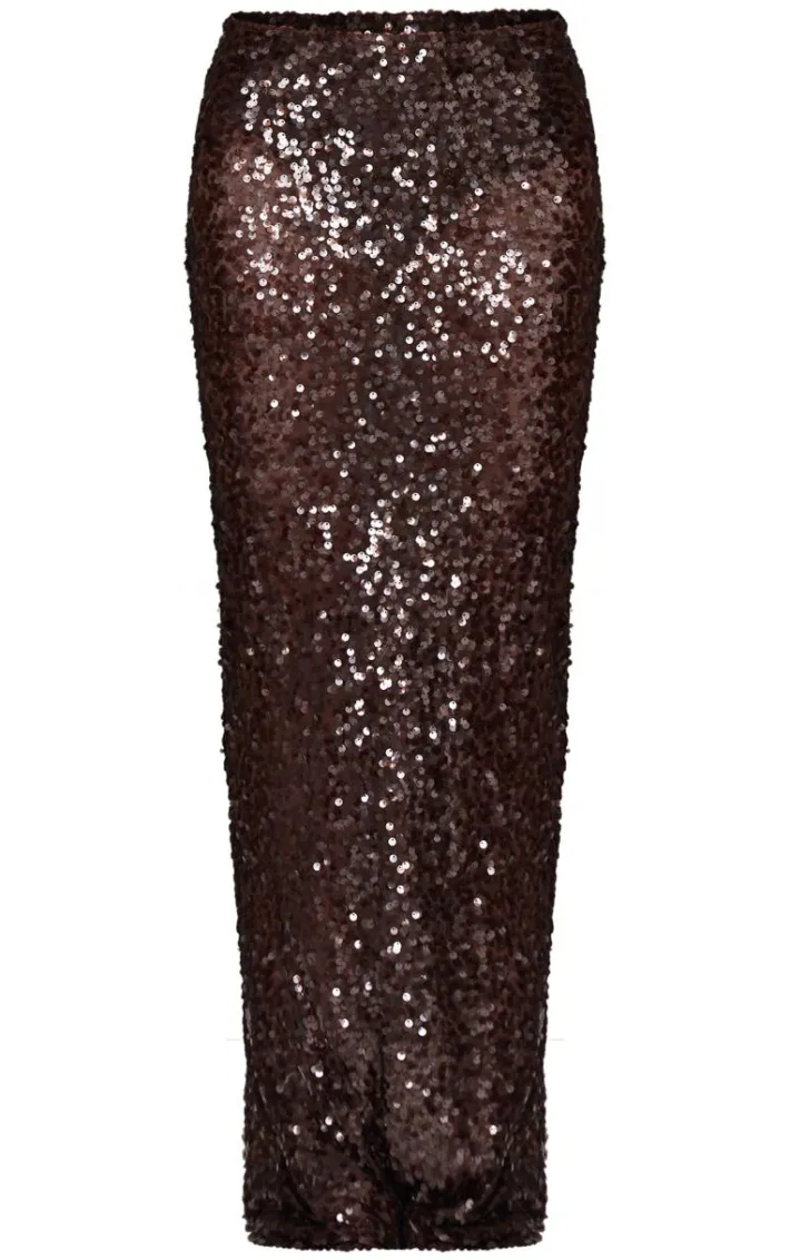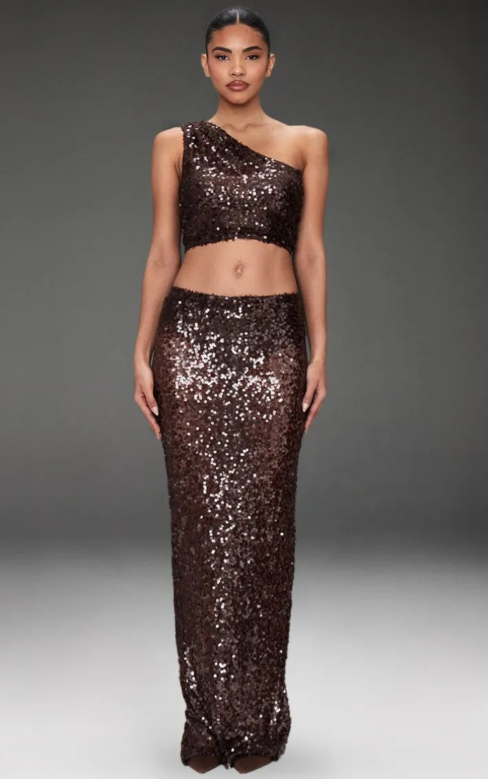 Add a statement piece to your wardrobe with this dark brown sequin mesh maxi skirt. Brought to you in a staple dark brown shade, with sequin detailing and an edgy mesh material, your weekend plans just got better. Style with the matching top and a pair of heels to finish the look.