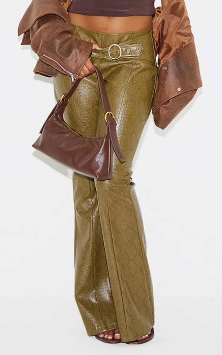 Get ready to have all eyes on you with these dark khaki snake print faux leather low rise pants. These pants are brought to you in a dark khaki snake print faux leather material with a low rise fit and a flared style, what more could you ask for? Wear with a white crop top your dreamy high heels and accessories for a look that we can’t stop crushing on this season.