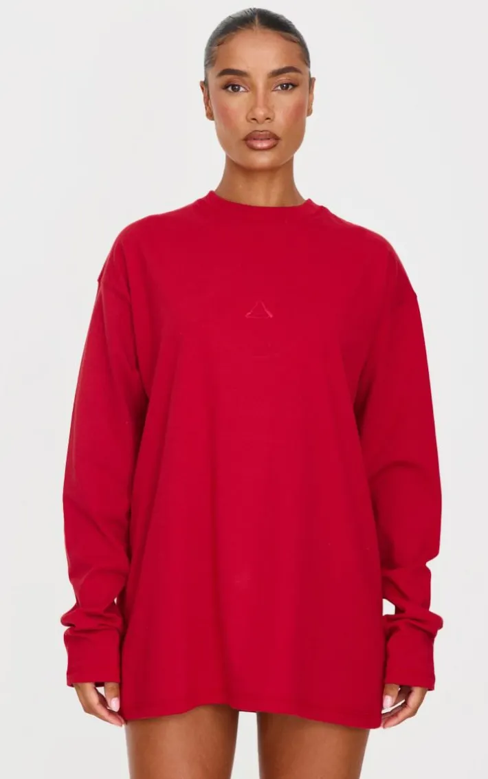 Stay active during those colder weather days with this dark red print oversized long sleeve t-shirt. Brought to you in a dark red hue, with a logo print front and cosy oversized fit, it’s all the new you need. Go for that two piece set look with matching dark red bottoms or style with a contrasting color and sneakers to make a statement.