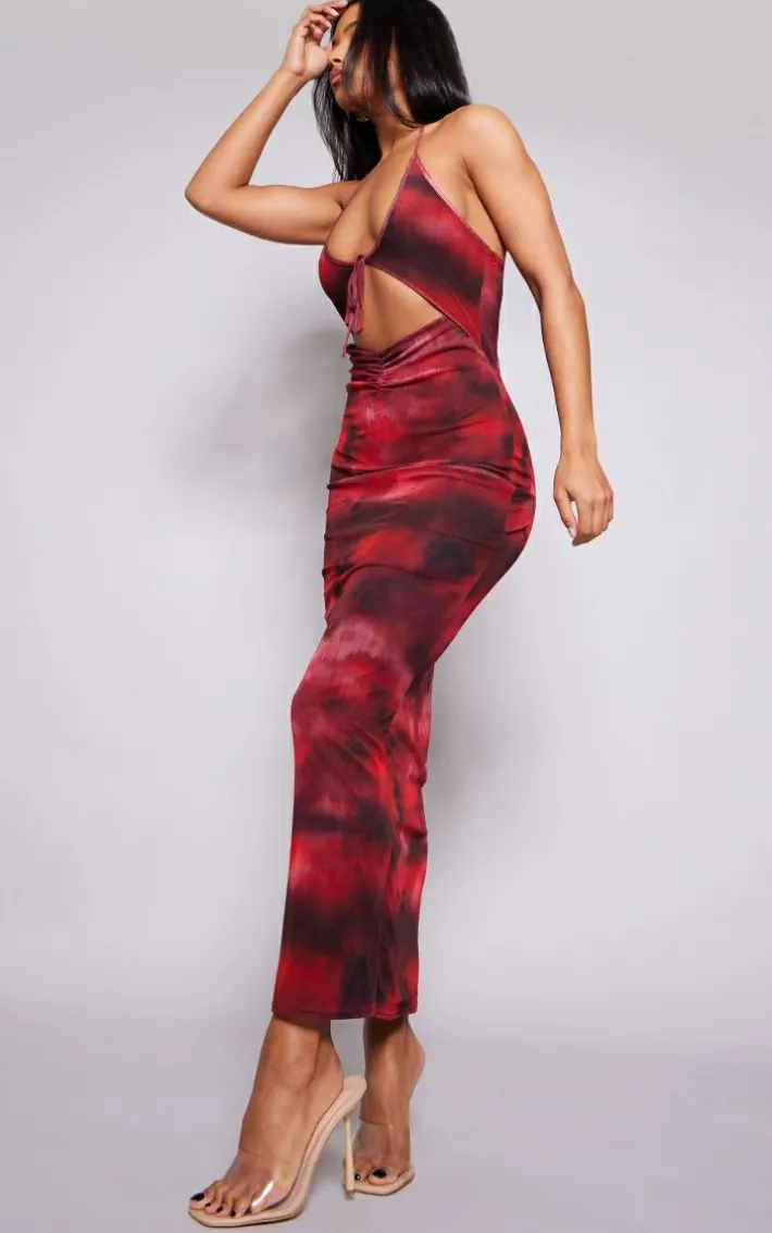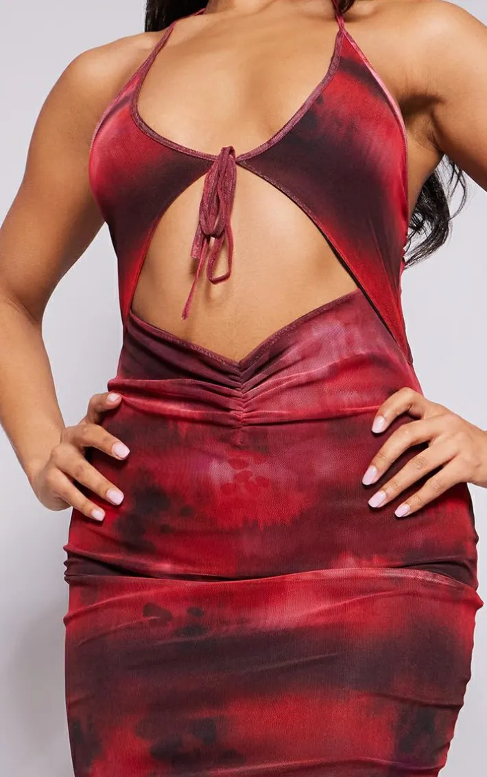 You are guaranteed to steal all the stares in this dark red printed mesh cut out halter neck midaxi dress. Brought to you in a dark red printed mesh material with a halterneck design, cut out detailing and a flattering midaxi fit, how can you not fall in love? Style this midi dress with heels and simple gold accessories for an occasion look to be remembered.