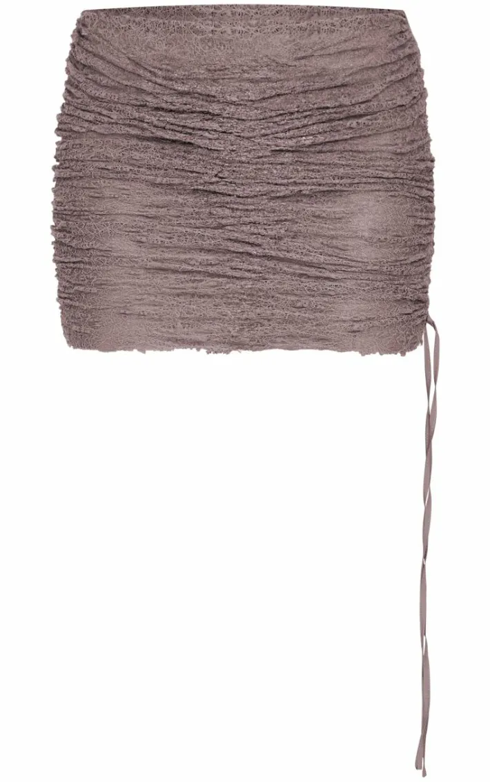 Take any look to new heights with this deep taupe textured lace ruched mini skirt. Brought to you in a deep taupe textured material with a lace ruched design and a mini length, we are seriously obsessing over this skirt. Team with a pair of heels and a long sleeve top for a look like no other.