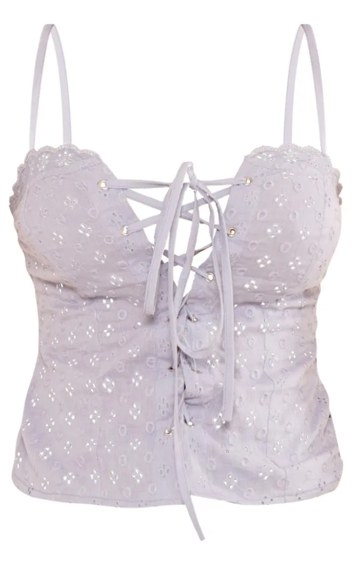 Say hello to this dusty blue broderie lace up front longline corset. Brought to you in a dusty blue broderie material with a lace up front fastening and longline design, this corset is a must-have. Style seamlessly with a denim mini skirt and white flats for a luxe look we’re loving this season.