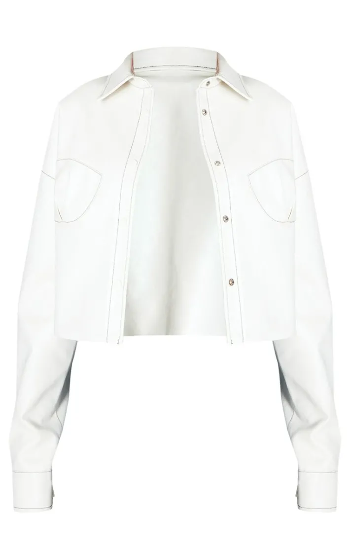 Upgrade any outfit of the day with this ecru faux leather cup stitching detail crop jacket. Brought to you in an ecru faux leather material with cup stitching and cropped length, this jacket is unreal. Style with jeans, a white tee and box-fresh kicks for the ultimate look.