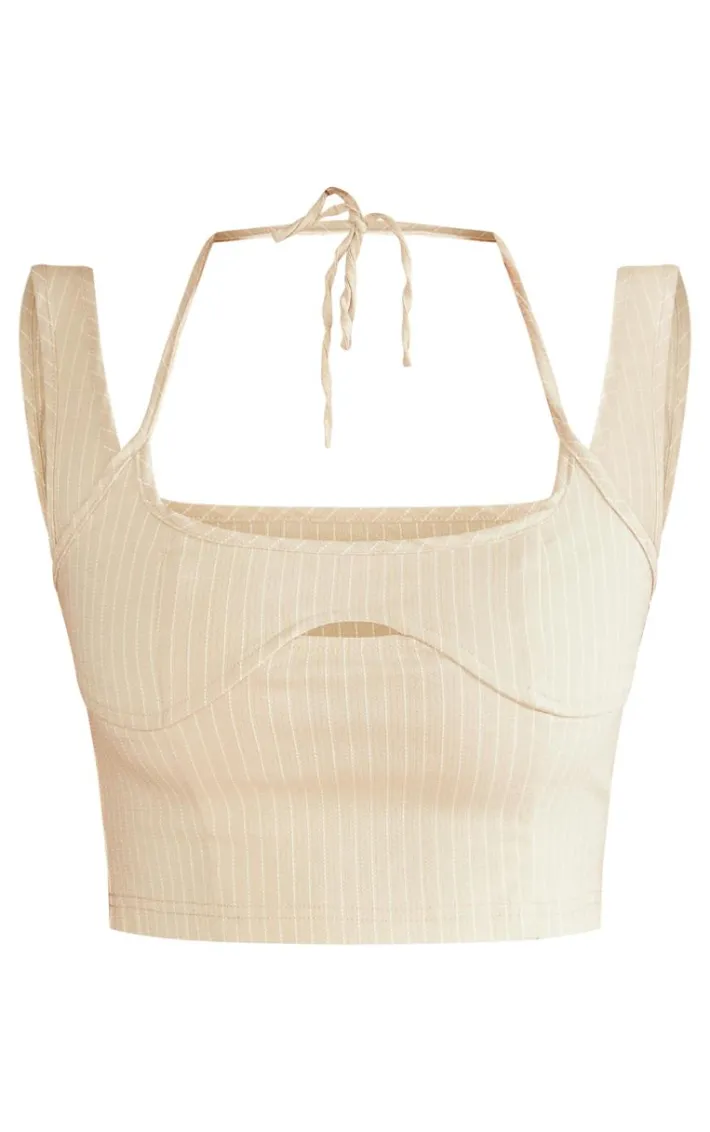 Look effortlessly chic in this ecru tailored pinstripe strappy cutout crop top. Brought to you in an ecru pinstripe material with a tailored fit, cutout design and strappy shoulder, what’s not to love? Style this crop top with tailored bottoms, sandals and accessories for a look we just can’t get enough of.