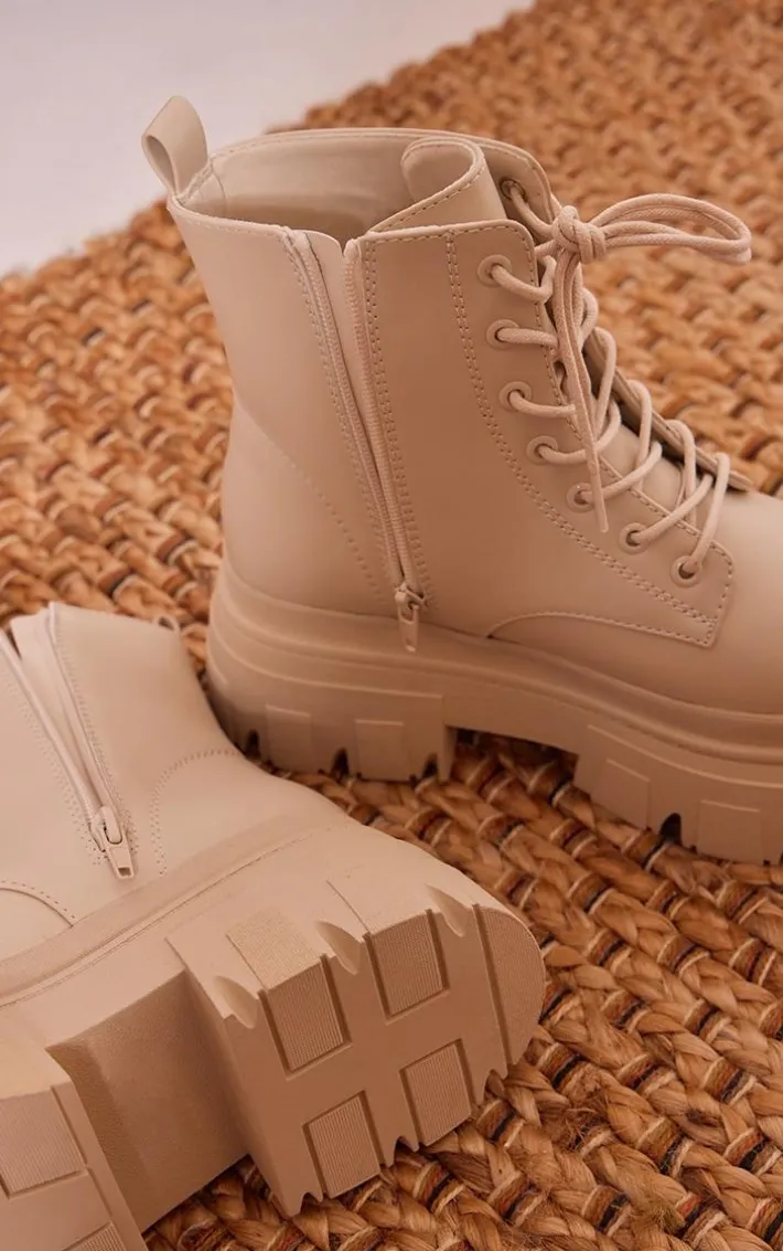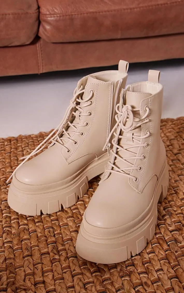 Take your outfit of the day to a whole new level with these ecru wide fit PU leather chunky platform lace-up ankle boots. Brought to you in a ecru PU material with a chunky platform design and lace-up detailing, how could you not be obsessed? These ankle boots are sure to nail the A/W dress code and we know you won’t be able to resist adding it to your basket.