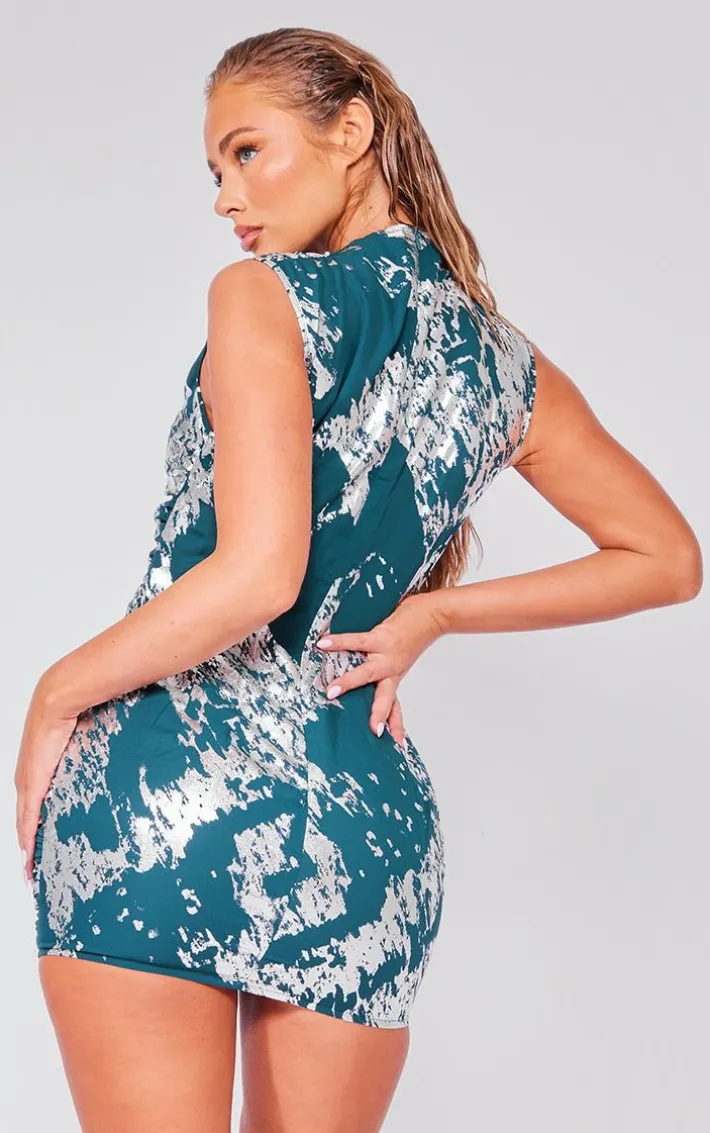 Enter the weekend in style with this emerald green foil print woven ruched sleeveless bodycon dress. Brought to you in an emerald green hue woven material with a luxe foil print for that extra touch of glam, how can you not be obsessed. In a sleeveless design and a flattering bodycon fit, you are sure to steal all the stares in this emerald green dress. Just add clear strap heels and accessories to completely elevate the look.