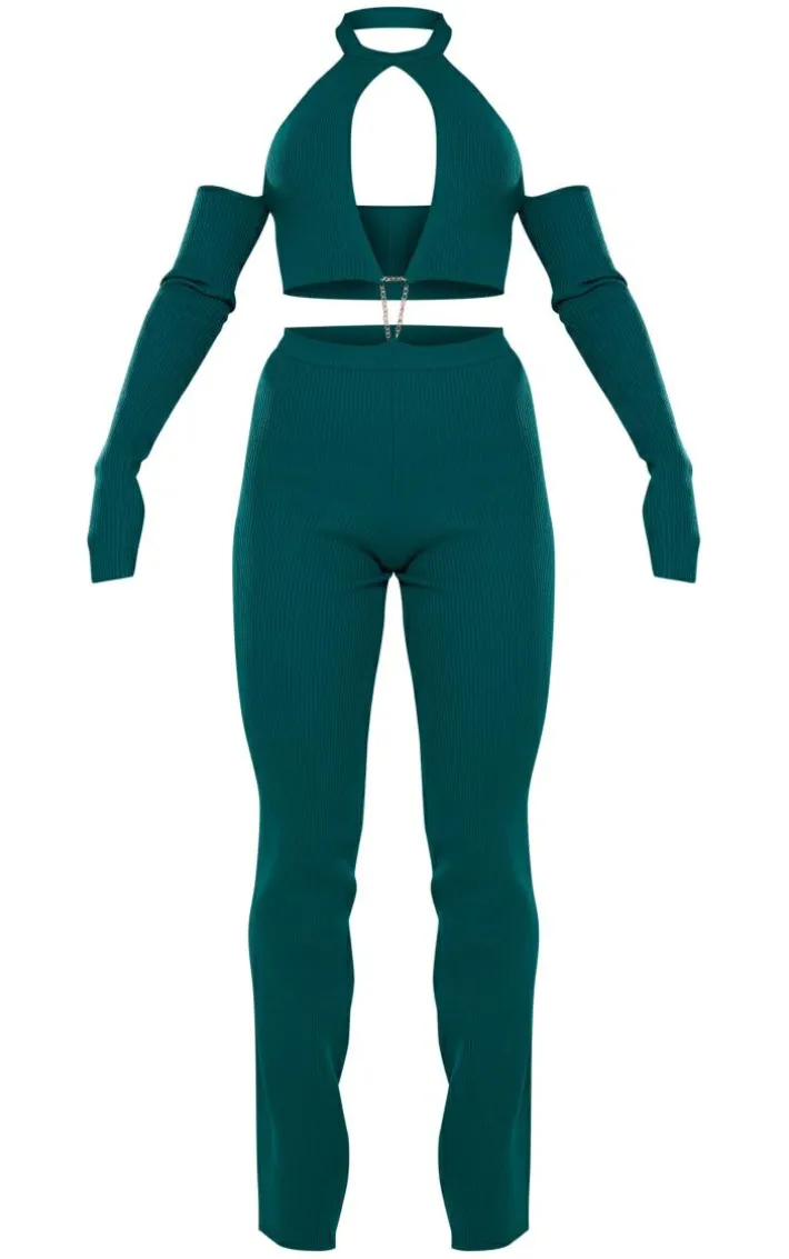 Be the ultimate show-stopper this season with this emerald green rib knit cut out chain detail jumpsuit, we’re seriously in love. This jumpsuit features an emerald green rib knit material with a cut out design and a chain detail. Style this green jumpsuit with your highest heels and simple accessories for a look no one will forget.