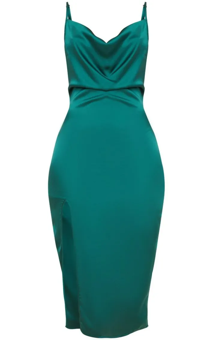 This emerald green satin dress is perfect for any occasion. Effortlessly versatile and seriously chic, you can’t go wrong with this style. Featuring an emerald green satin material with a cowl neckline, thin straps and a midi length,we are obsessed with this style. A cowl neck dress is a must-have wardrobe staple you need in your wardorbe right now. Just pair it with some barely there heels for a look that will have all eyes on you.
