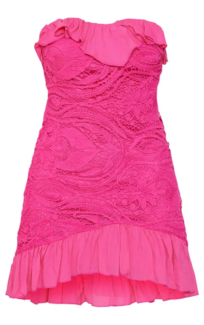 Found some last-minute weekend plans ? Then you need to add this fuchsia bandeau floral lace bodycon dress to your basket. Made from a fuchsia material with a floral lace design, how could you say no? Be prepared to turn heads for all the right reasons in this bandeau bodycon dress. Simply add your fave heels and gold accessories for a flawless finish.