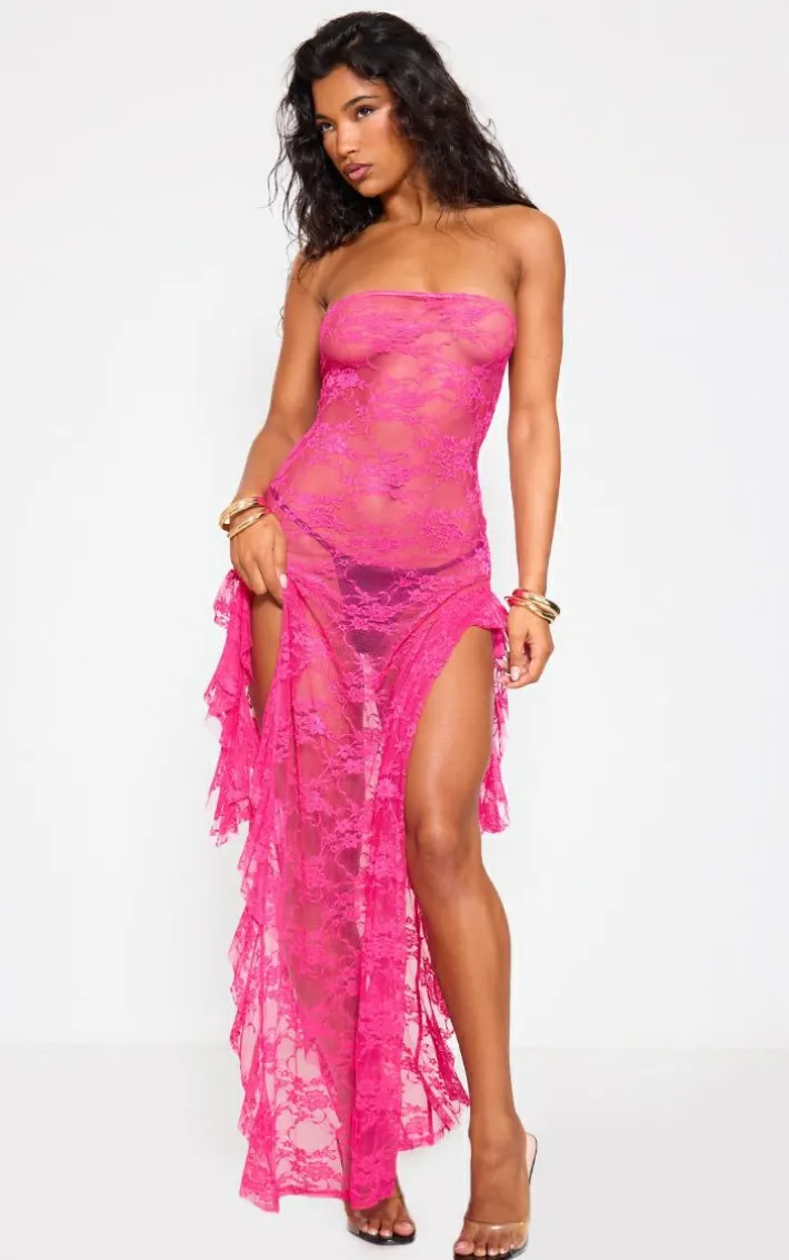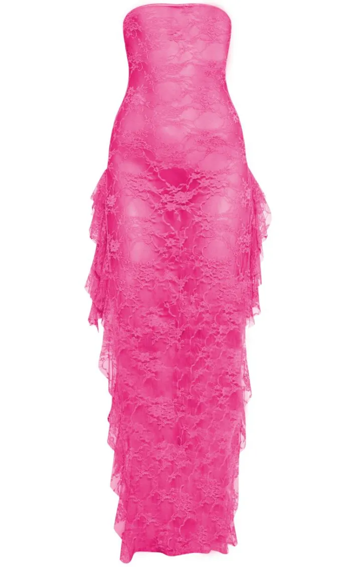 Stand out from the crowd for all the right reasons in this fuchsia lace bandeau split leg frill edge maxi dress. Brought to you in a fuchsia hue lace material with a bandeau neckline, a side split design and a frill edge detailing, how can you not fall in love? Style this maxi dress with heels and statement accessories for a look that won’t be forgotten.