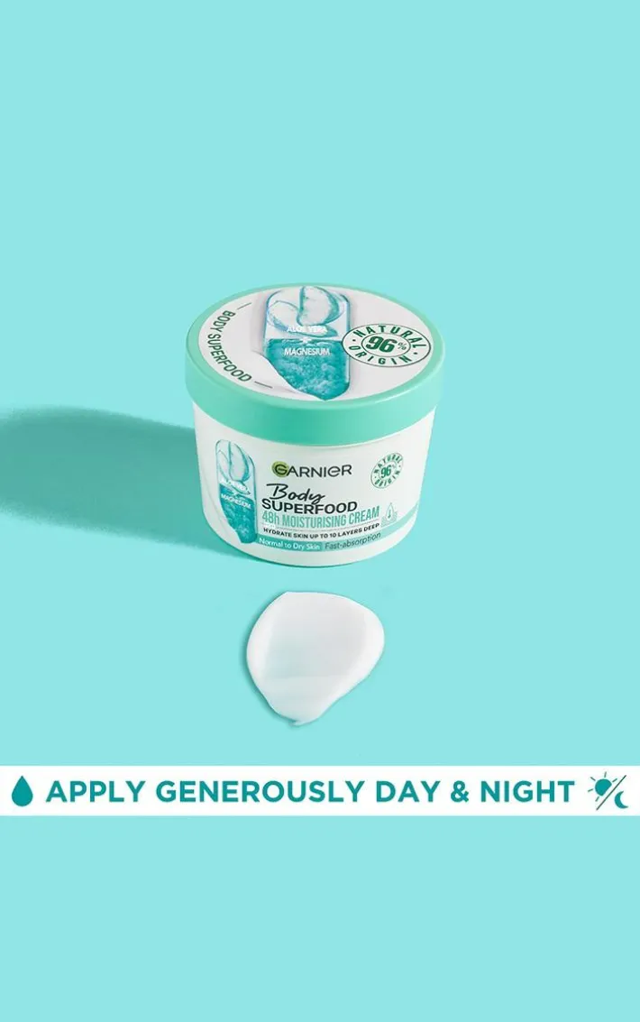 Garnier Body Superfood Aloe Vera & Magnesium is formulated for normal to dry skin and enriched with two powerful key ingredients! Aloe Vera is known for its powerful hydrating nutrients and cooling properties & Magnesium-PCA is a trending natural-origin mineral known for its soothing properties.This powerful cream leaves the skin feeling instantly hydrated, up to 10 layers deep*, for results you can feel and provides up to 48 hour moisturising**.With ingredients of 96% Natural Origin – this product is a vegan formula.All Garnier products globally are officially approved by Cruelty Free International under the Leaping Bunny Programme, the leading organisation working to end animal testing worldwide, and the recognised Cruelty Free Gold Standard.