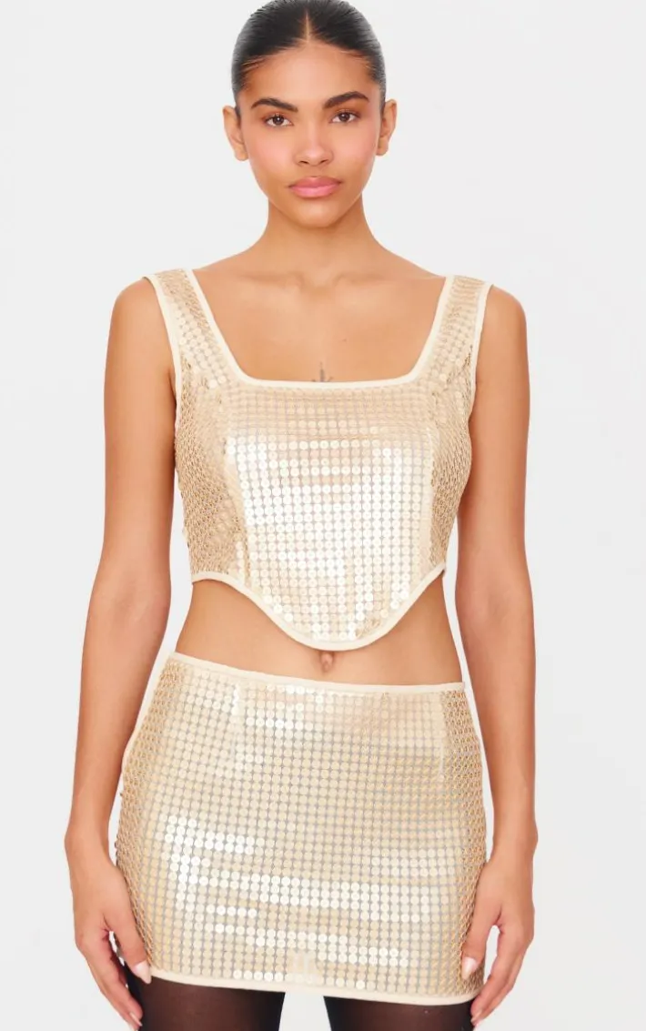 Elevate your weekend styling with this gold chain sequin low rise micro mini skirt. Brought to you in a gold hue chain sequin material with a low rise design and micro length, this mini skirt is all the new you need. Style with the matching corset top, sheer tights and slip on heels for a look like no other.