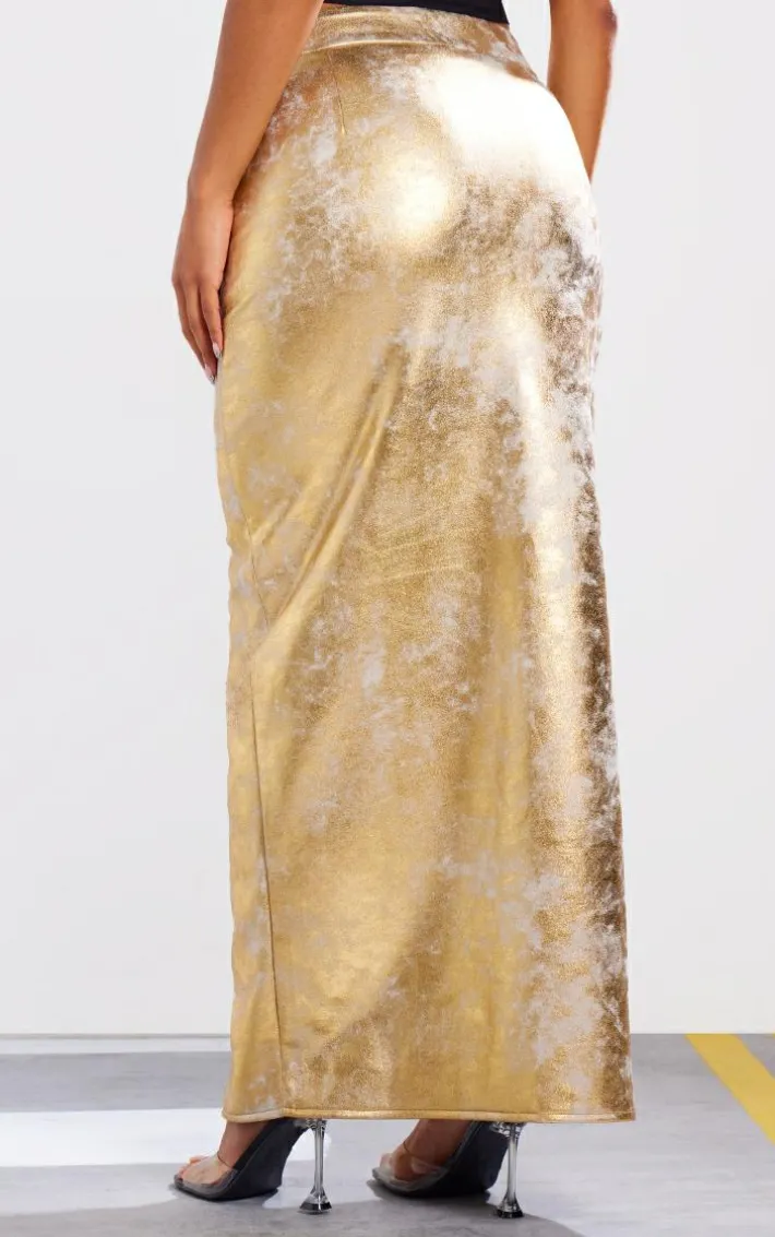 Steal the show in this gold coated split back maxi skirt. This maxi skirt is brought to you in a gold coated material with a split back and a maxi length, how could you say no? This maxi skirt is everything you need for your weekend styling. Complete the look and style this with a black corset, high heels and accessories for a look like no other.