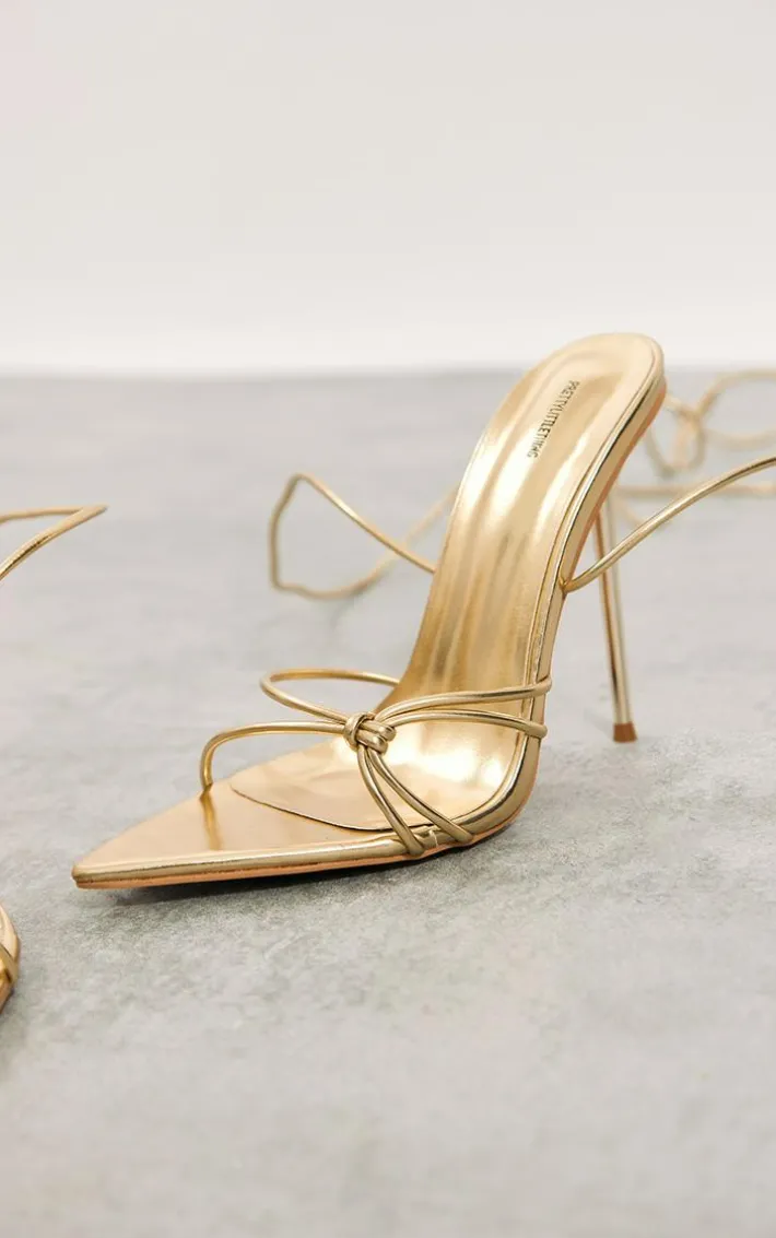 These gold faux leather metallic pointed knot detail tie up heeled sandals are a must have in your wardrobe. With a gold faux leather material, these heels are bringing all the luxe vibes to your collection. These heels have a pointed toe, knot detail and a tie up fastening, we are obsessed. Add to your evening look to stand out from the rest.