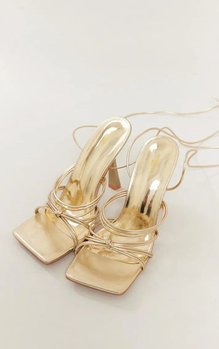 Add all the glam vibes to your vacay wardrobe with these gold metallic wide fit strappy knot detail square lace up high-heeled sandals. With a gold metallic PU material, strappy tie-up fastening, a knot detail and a high heel, you won’t be able to resist. These heeled sandals are at the top of our hitlist this season and are the must-have piece that needs to head straight into your basket.