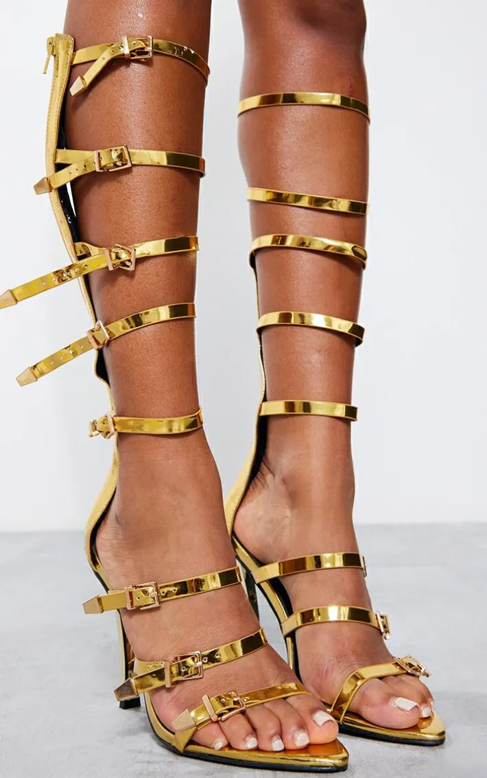 Bring all the attitude to your new season wardrobe with these gold pointed multi buckle strap knee high heeled sandals, you’re sure to have heads turning for all the right reasons. These sandals feature a gold hue material with a multi buckle strap design and a high heel, how could you resist? Pair these gold sandals with your fave weekend fit for a fierce finish.
