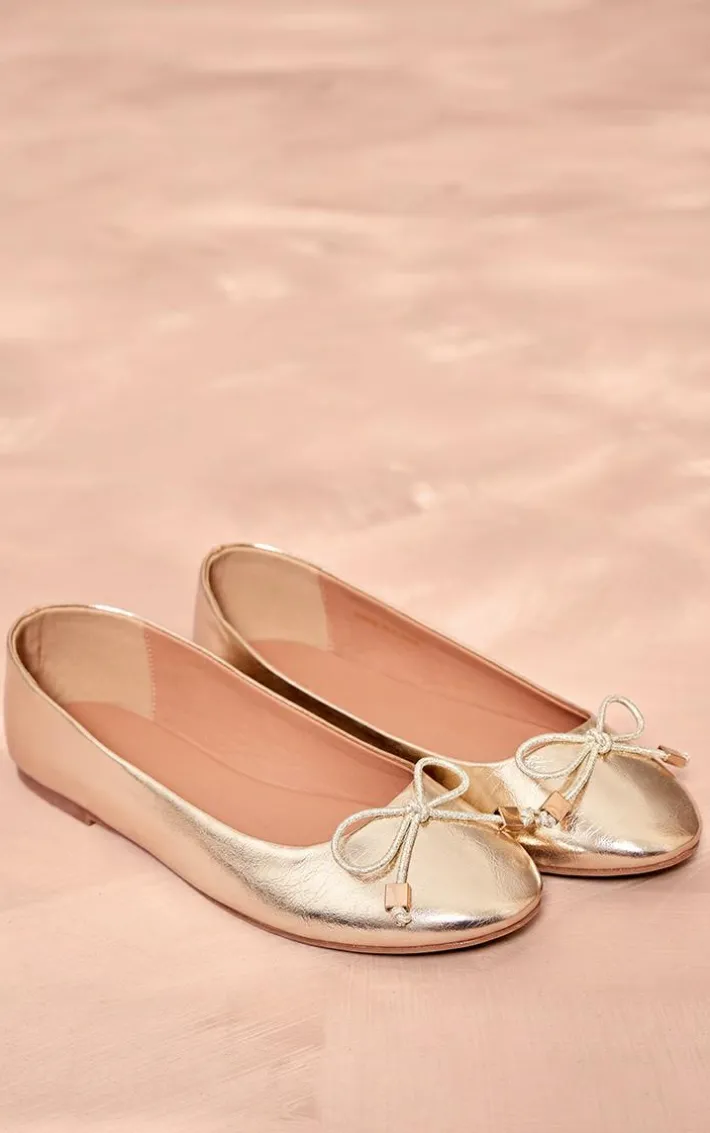 Be on trend this season and add these gold PU round toe bow detail ballet pumps to your basket. Brought to you in a gold crinkle PU material with a round toe design and a bow detail, we are obsessed. These ballet pumps are the ultimate must have in your collection, shop the look today.