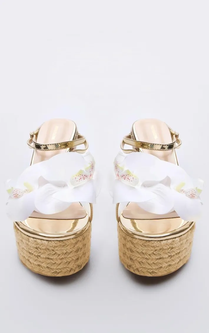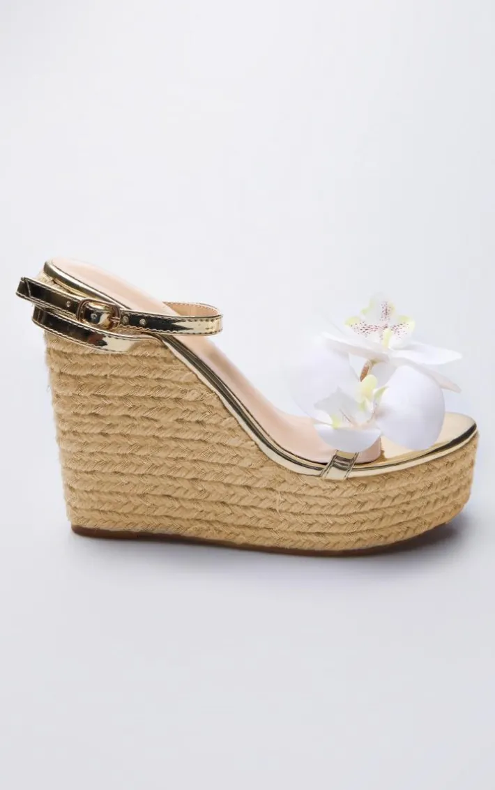 You’re in need of these gold PU white flower metallic strap espadrille high heeled wedges. Brought to you in a gold PU material with a white flower metallic strap detail and espadrille high heel, these wedges are at the top of our wish list. No outfit of the day is complete without them. Style with your fave pieces for a glam finish.