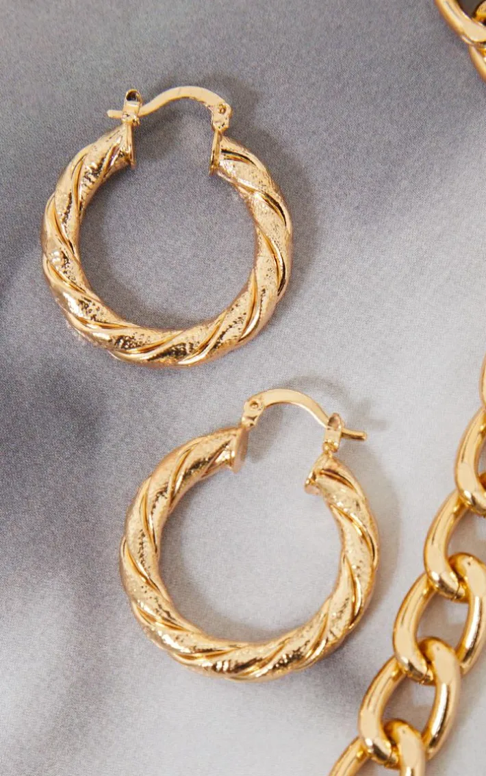 These hoops are a must to complete any look. Featuring a gold twist rope design hoop, we are obsessed. Team these your outfit of the day.