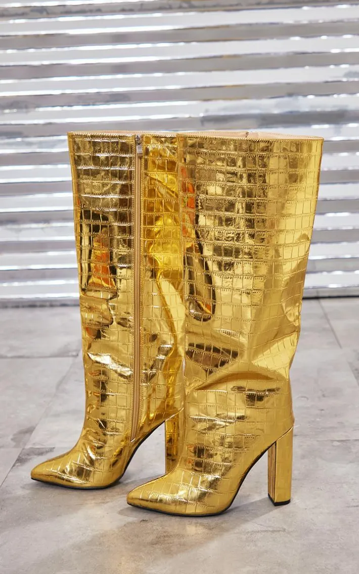 Get ready to make a statement in these boots. Featuring a gold metallic croc material with a wide fit, a point toe design and high block heels, we are obsessed.