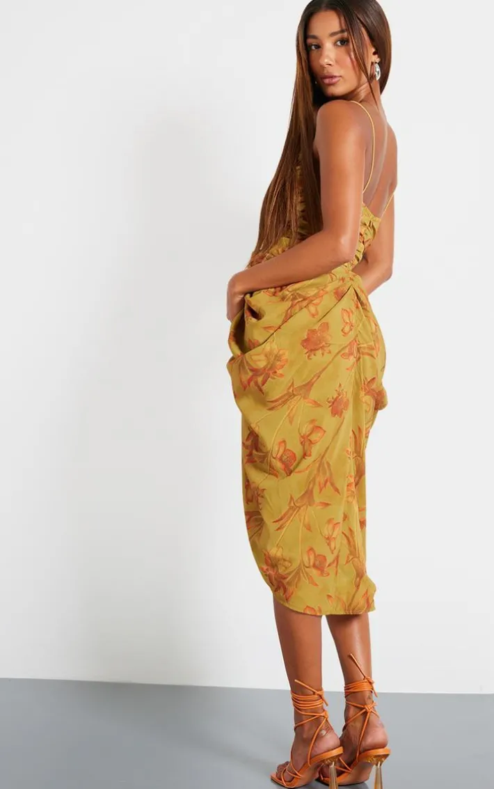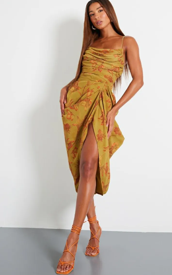 Got an occasion planned? This green abstract print chiffon ruched drape midi dress is here to solve all of your ‘what to wear’ dilemmas’. Made from a green chiffon material with an abstract print design, ruched drape detailing and a midi fit, we are in love. Style this midi dress with heels and gold accessories for a look that won’t be forgotten.