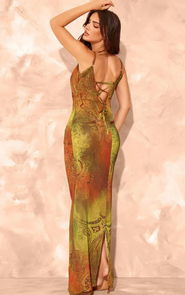 Make heads turn for all the right reasons in this green abstract print sheer chiffon lace up back maxi dress. Brought to you in a green hue sheer chiffon material with an abstract print design, lace up back detailing and a flattering maxi fit, how can you not be obsessed? Style this maxi dress with heels and gold accessories for a look that is perfect for your next occasion.