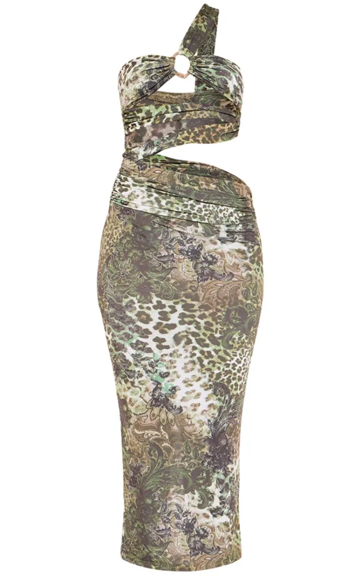 Show off your shape in this green animal print slinky ring detail cut out midaxi dress. Brought to you in a green slinky material with an animal print design, you will be setting major trends wherever you step foot. This midaxi dress has a ring detail and a cut out design, it’s a yes from us. Team this unreal dress with a pair of clear heels and your go-to accessories for a look like no other.