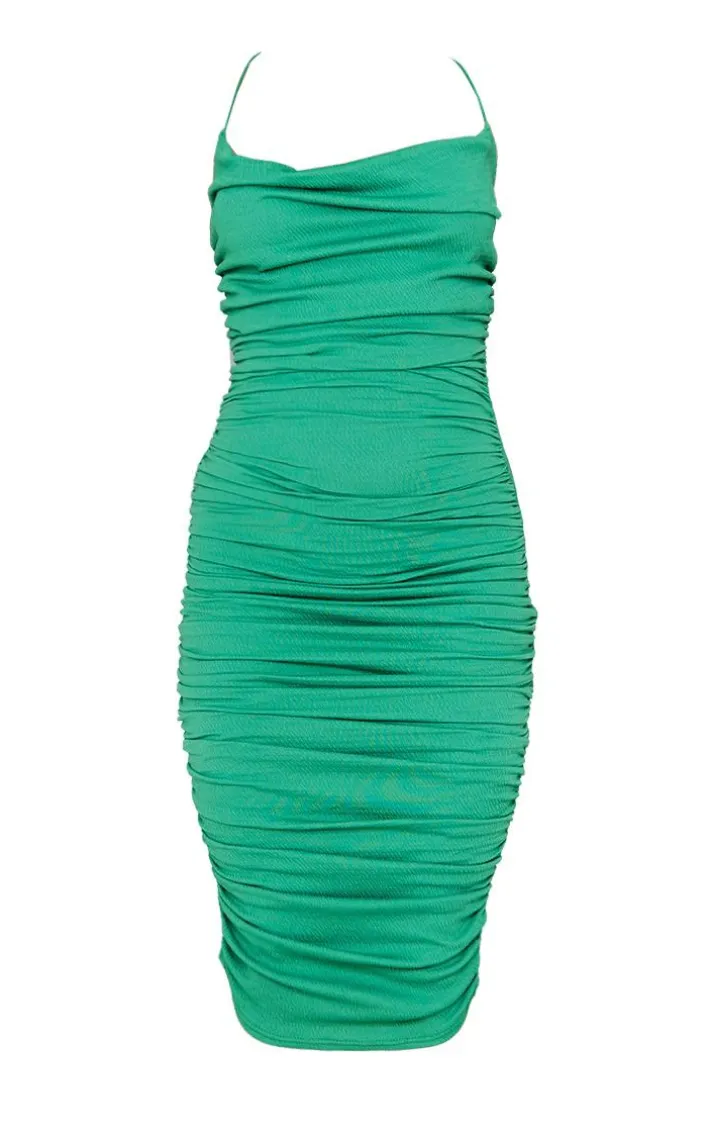 Got a special occasion to attend? Then look no further than this midi dress. Featuring an green crinkle textured material with a cowl neckline and midi length. Style this with strappy heels and gold accessories to complete the look.