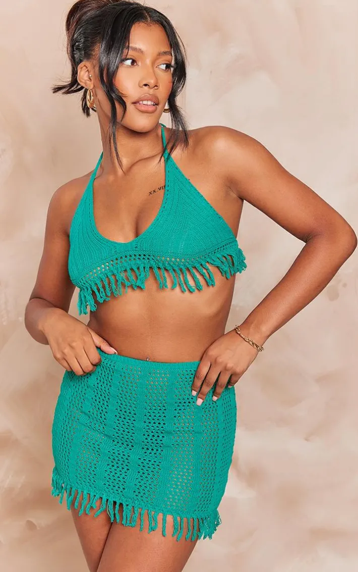 We are all about the crochet feels this season and this green frill edge detail crochet bralet is about to earn you some serious style points. Brought to you in a green hue crochet material with a frill edge design and a bralet style, what more could you ask for? We are loving this crochet bralet styled with the matching skirt, bold hue heels and a matching mini bag for a look that will really make a statement on your next vacay and beyond.