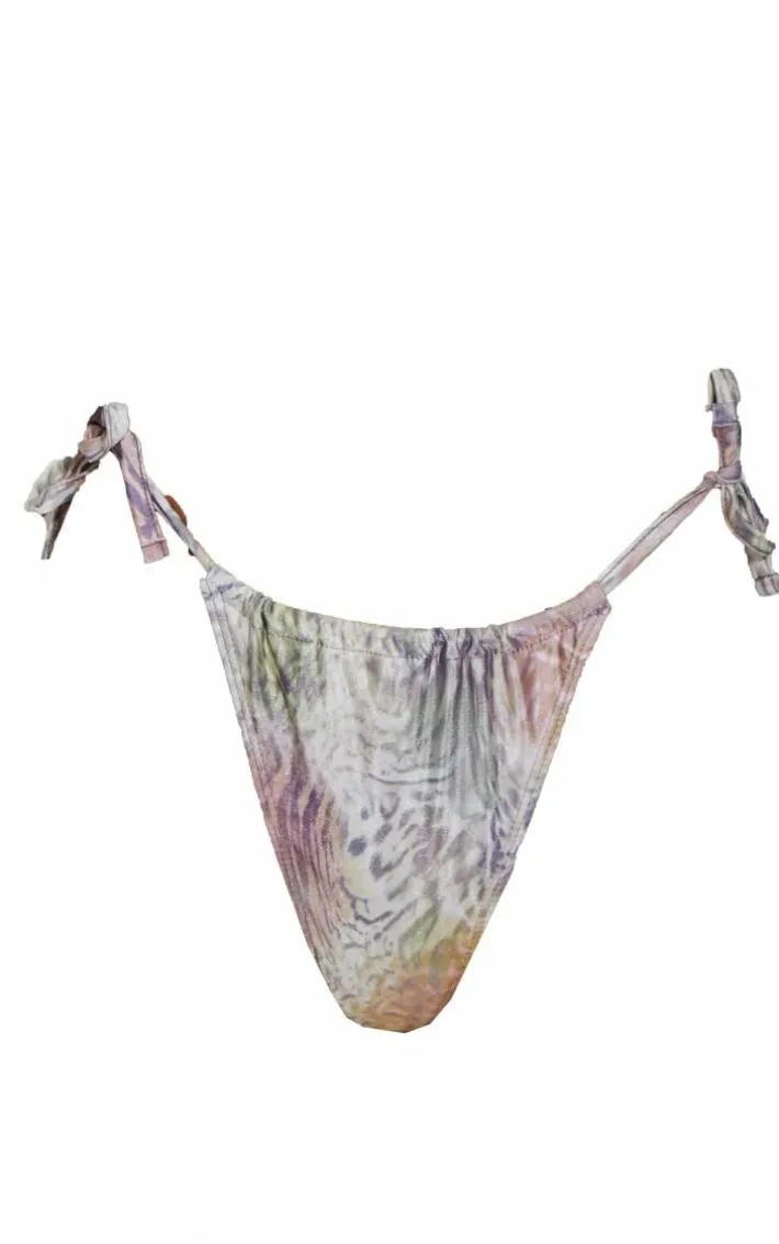 Add some fierce vibes to your vacay wardrobe with these green muted animal print micro mini tie side bikini bottoms. Brought to you in a green muted animal print material with a tie-side fastening and a micro mini design, how could you say no? These bikini bottoms are bound to steal all the stares whether you’re relaxing by the pool or on the beach. Style seamlessly with the matching top, silver hoop earrings and sunnies for a look that is sure to impress.