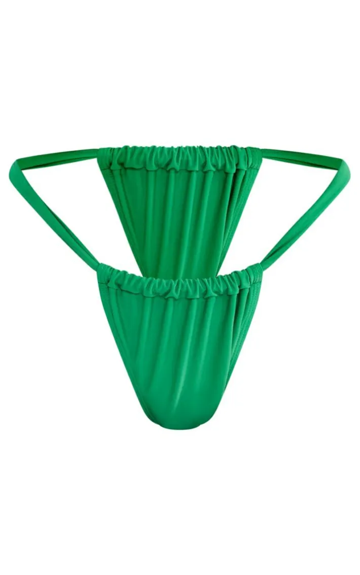 Be sure to stand out from the rest in these green ruched tanga bikini bottoms. Brought to you in a green hue material with a flattering tanga fit and ruched detailing, we just can’t get enough. Style these bikini bottoms with the matching bikini top and gold accessories for a poolside look you will be reaching for again and again.